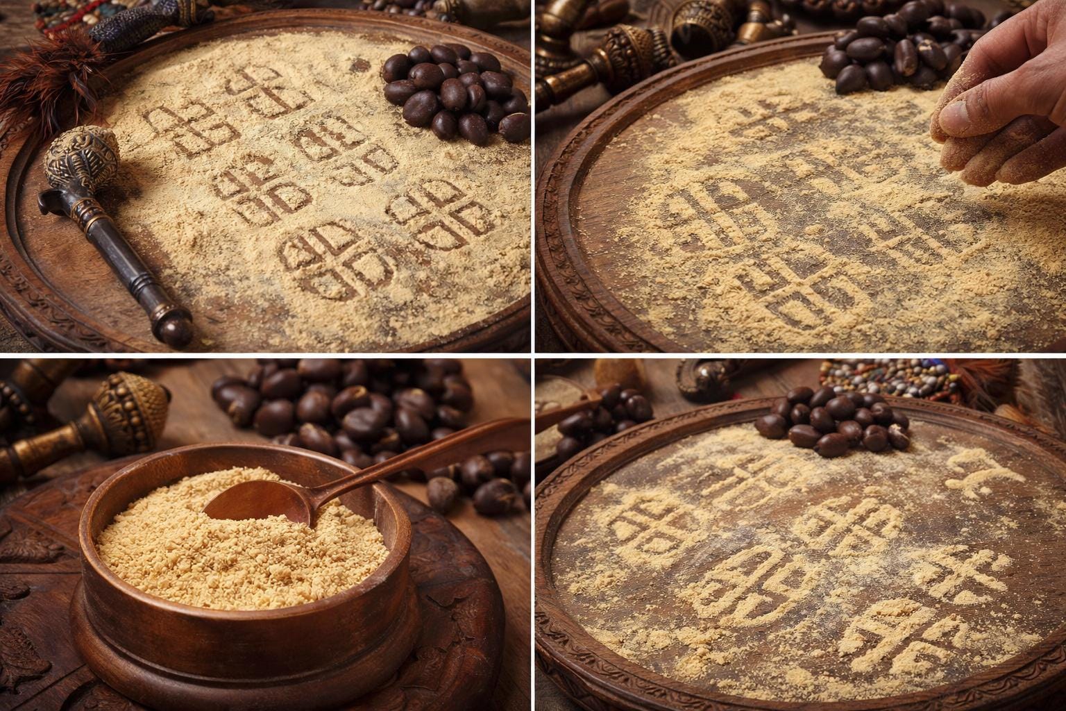 🟡 Escrita dos Odù – É usado para desenhar os Odù de Ifá no Opón Ifá (tabuleiro de Ifá). – Substitui tinta ou giz: Ifá “fala” através dele.